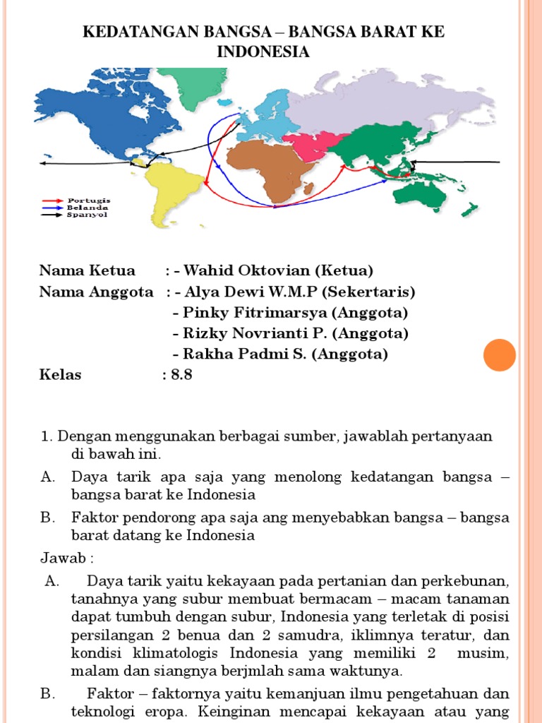 Sejumlah bangsa barat dari eropa pernah menjajah indonesia. Rute pelayaran yang diambil mengikuti rute columbus pada pelayaran sebelumnya. Ingin membuktikan bahwa bumi itu bulat. Ada beberapa bangsa barat yang datang ke indonesia antara lain, belanda, portugis, spanyol, dan inggris. Rangkuman materi lengkap kedatangan bangsa barat ke indonesia meliputi bangsa portugis, spanyol, belanda dan inggris beserta sub pembahasan terkait lainnya. Perang tersebut terjadi lebih dari dua abad sehingga membawa banyak perubahan, salah satunya. Faktor kedua yang mendorong kedatangan bangsa barat ke indonesia adalah untuk mencari kejayaan (glory). Datangnya bangsa barat ke indonesia tidak terjadi secara bersamaan. Pada tahun 1486, bartolomeus diaz melakukan pelayaran pertama menyusuri pantai barat afrika. Indonesia dijajah oleh 6 negara selama lebih dari 300 tahun. Kedatangan mereka dilakukan secara bertahap, dari satu negara kemudian pelayaran bangsa spanyol mencari rempah dilakukan oleh magellan. Kronologi datangnya bangsa barat dimulai ketika terjadi perang salib di eropa. Text of peta rute perjalanan bangsa eropa ke indonesia.docx.